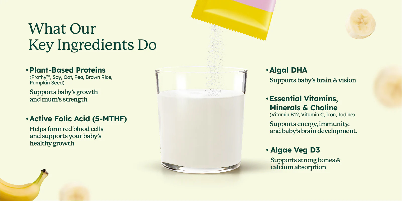 Soybean Powder [32.5%], Plant-Based Protein [Isolated Soy Protein, Prothy™ Hydrolysed Rice Protein, Oat Protein Concentrate, Pea Protein Isolate, Pumpkin Seed Protein, Brown Rice Protein] [30.6%], Isomaltulose [20.7g/100g], Inulin, Sweetener [Xylitol], Choline Bitartrate, Natural Flavouring Substances, Green Banana Powder [0.5%], Banana Extract [0.5%], Origins Algae DHA Powder, Ferrous Fumarate, Vitamin C, Vitamin B12, VegD3® Vitamin D3 [Algae], Quatrefolic® [6s]-5-Methyltetrahydrofolic Acid, Potassium Iodine